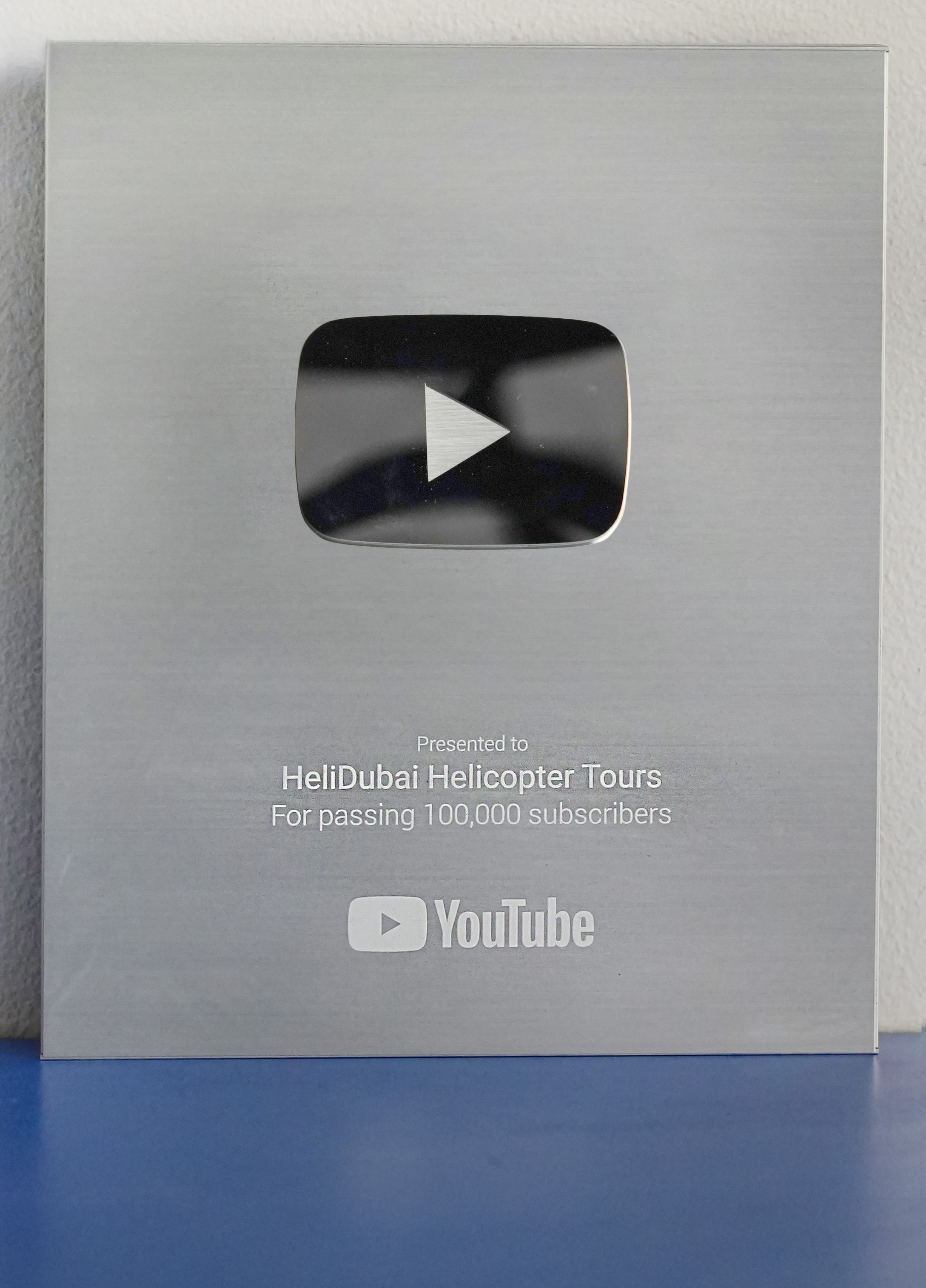 HeliDubai just achieved a rare global milestone in the helicopter tour industry, receiving the YouTube Silver Play Button Award for reaching 100,000+ subscribers.